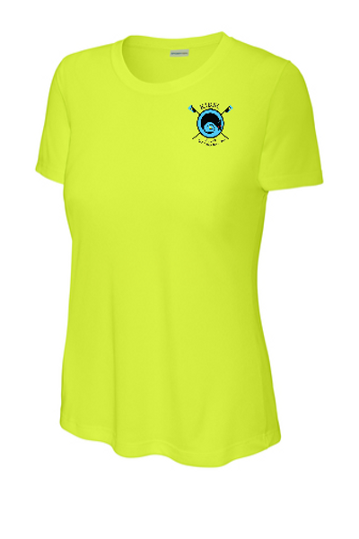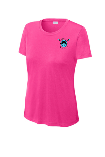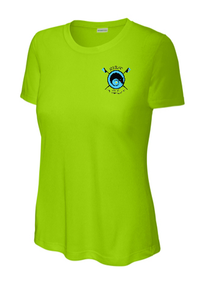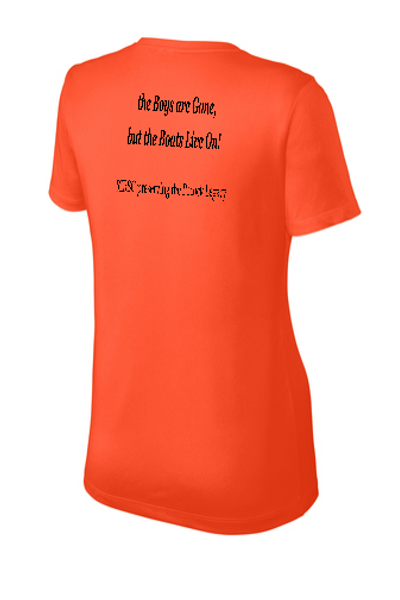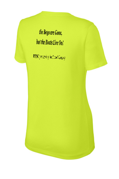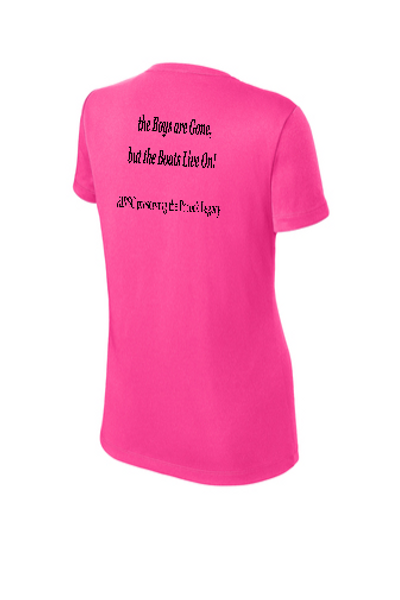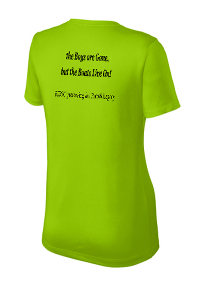 Sport-Tek Ladies crew neck T-shirt with logo on left front and "the boys are Gone, but the Boats Live On!" quote across back.
