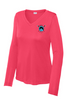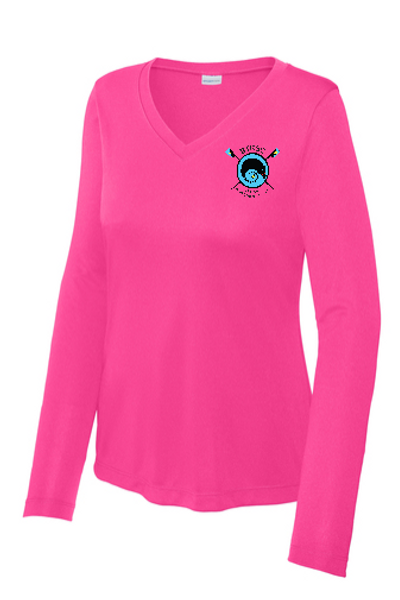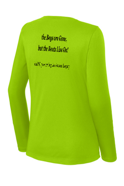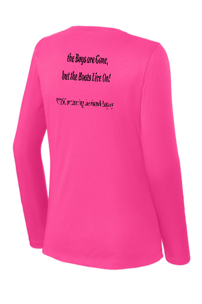 Sport-Tek Ladies V-neck long sleeve T-shirt with logo on left front and "the boys are Gone, but the Boats Live On!" quote across back.