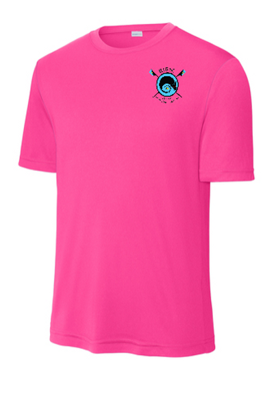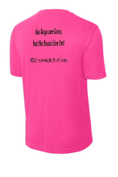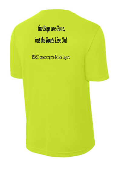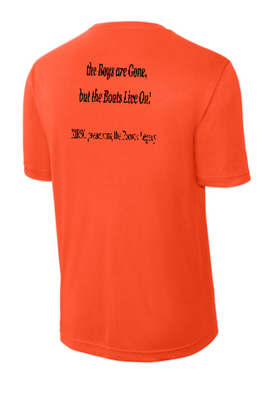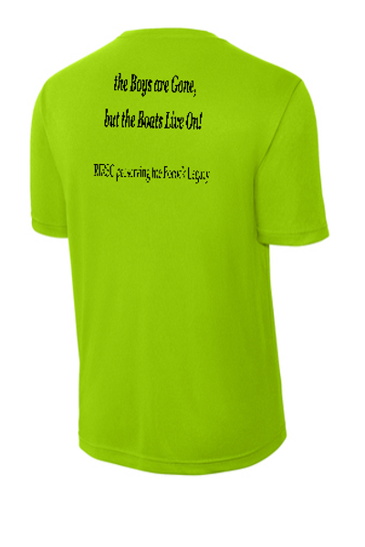 Sport-Tek Mens Short Sleeve T-shirt with logo on left front and "the boys are Gone, but the Boats Live On!" quote across back.