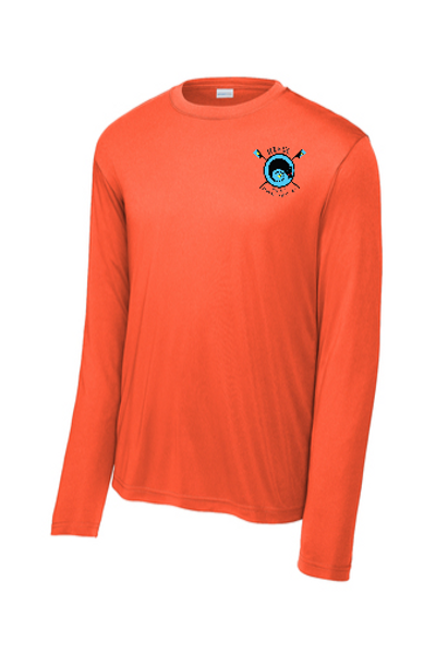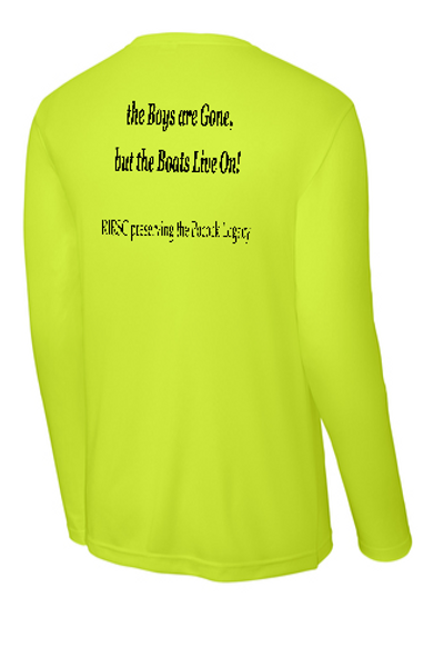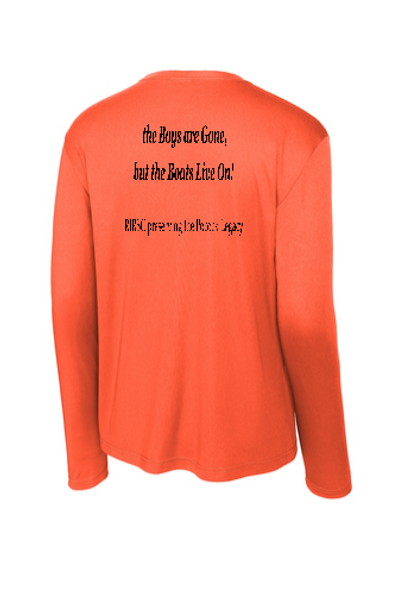 Sport-Tek Mens Long Sleeve T-shirt with logo on left front and "the boys are Gone, but the Boats Live On!" quote across back.